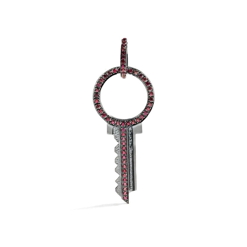 Oops, sorry, our locksmith is so awkward; he scattered rhodolites all over your key.Metal: 925 SilverStones: RhodolitePlating: Black RhodiumWidth 23 mmLength60 mmWeight 6.48 g