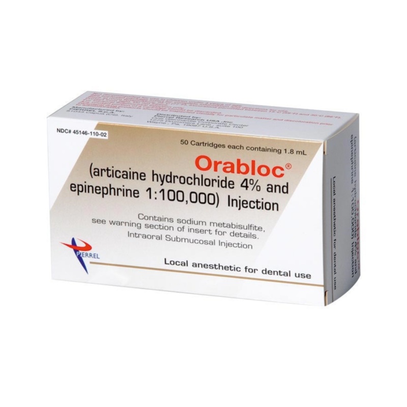 Orabloc is the only aseptically manufactured articaine in the US.Rapid onset of anesthesia within 1-9 minutesComplete anesthesia lasts about 1 hour for infiltration, up to 2 hours for nerve blockMost common adverse reactions (incidence >2%) are headache an