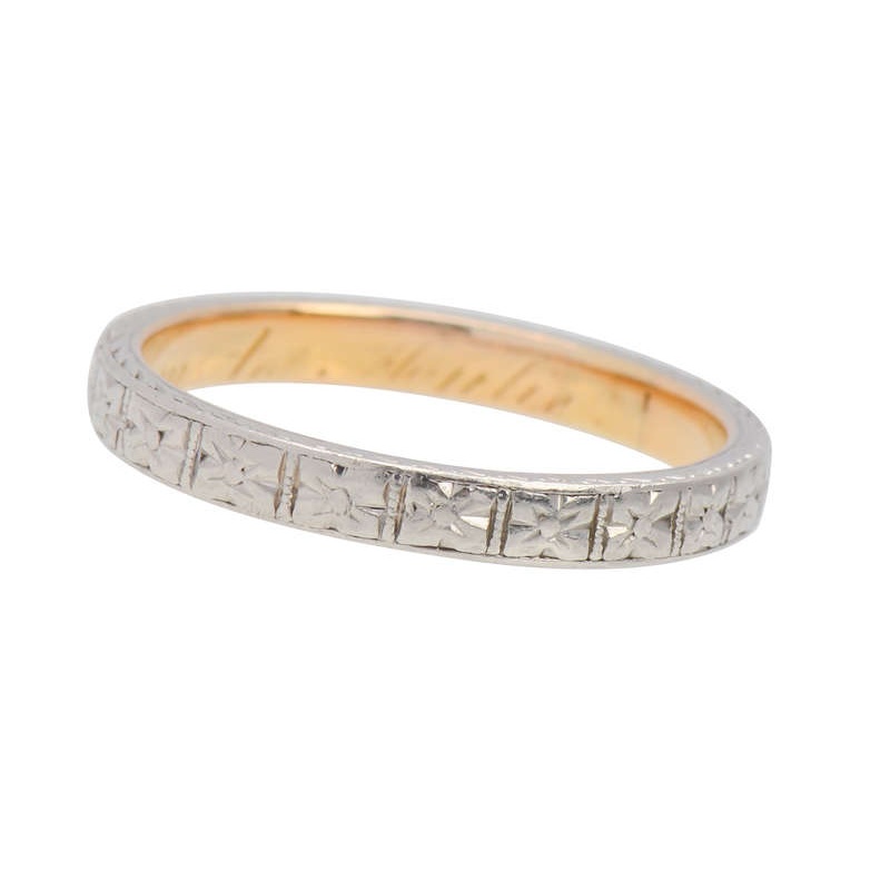 Running around the outside of this 18k wedding ring is the orange blossom pattern. Petite flowers, one after the other, are arrayed in white gold. To the interior of 18k yellow gold, the original inscription reading, "Tom to Montie" in hand engraved script
