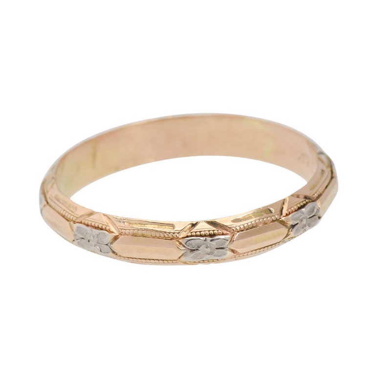 Orange blossom patterns in 14k white gold are arranged between pattern 14k rose gold.Showing off two colors, this vintage ring has enough presence by itself, or can be stacked with other bands and rings. Symbolic, the orange blossom has been known through