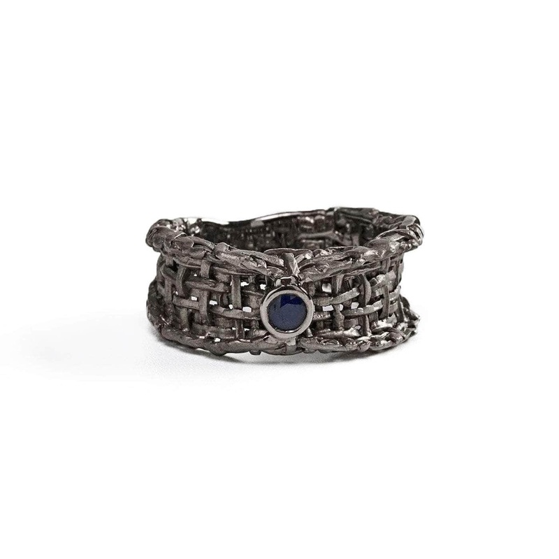Edgy and torn this expressive ring of black rhodium holds within its design a feeling of tormented beauty. Its shapes and folds have a pained beauty that allows us to be truly captivated. A glimmering blue sapphire offers a promising spark of hope from within.