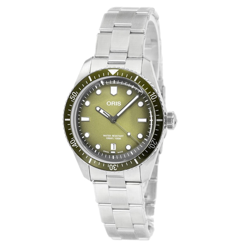 TECHNICAL DATABrand: OrisFamily: DiversReference: 01 733 7707 4057-07 8 20 18Name: Oris 01 733 7707 4057-07 8 20 18 Divers 65 Green Dial AutoCASEMaterial: SteelGlass: Sapphire GlassDiameter: 40 X 0Case Thickness: 0Water Resistance: 10 ATMDIALColor: GreenDial Markers: No numeralsBezel: Stainless SteelMOVEMENTType: AutomaticCalieber: 733-1Base Caliber: -Reserve: 41 hoursBANDMaterial: Stainless SteelColor: SteelWidth: 20Clasp: Fold claspFUNCTIONSDate,OTHER FUNCTIONSLuminescent Hands,Luminous indexes ,Rotating Bezel ,