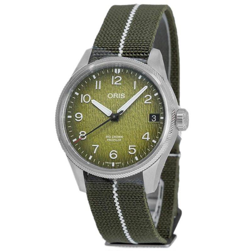TECHNICAL DATABrand: OrisFamily: ProPilotReference: 01 751 7761 4187-SetName: Oris Men’s 01 751 7761 4187-Set Okavango Air Rescue Ltd. Ed.CASEMaterial: SteelGlass: Sapphire GlassDiameter: 41 X 0Case Thickness: 0Water Resistance: 10 ATMDIALColor: GreenDial Markers: Arabic numeralsBezel: Stainless SteelMOVEMENTType: AutomaticCalieber: Oris 751Base Caliber: -Jewels: 26Reserve: 38 hoursBANDMaterial: TextileColor: GreenWidth: 20Clasp: BuckleFUNCTIONSDate,OTHER FUNCTIONSLimited Edition ,Luminescent Hands,Luminous indexes ,Screw-Down Crown ,