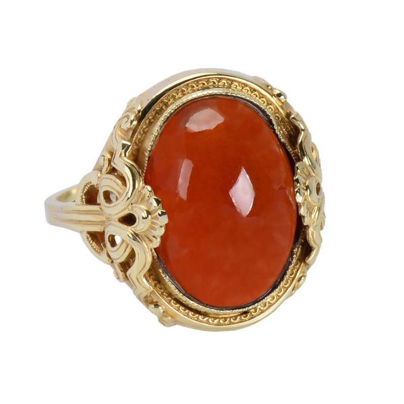 The setting in rich yellow gold rivals that luscious garnet. In 14k yellow gold, two ornate intertwining curvaceous elements with a crown of frills grace each side and shoulders. A finely detailed bezel hugs the natural garnet.