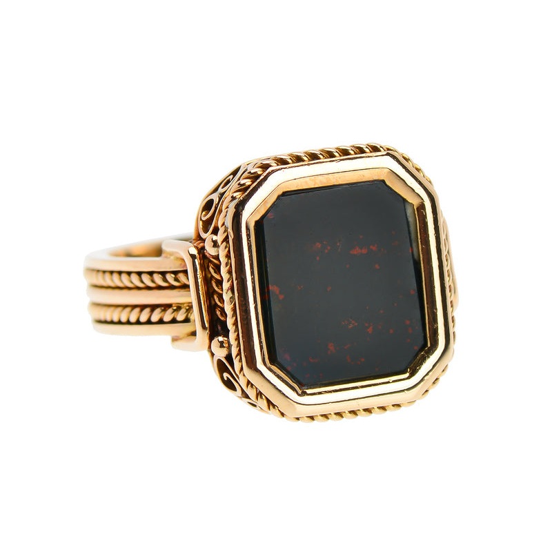 The bloodstone is showcased within an eight-sided yellow gold bezel underscored with a twisted gold rope surround.