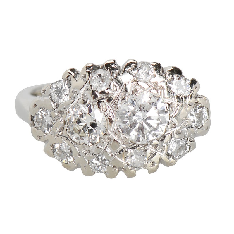 The estate ring features an arched surface centered with a brilliant cut diamond of .50 carats and an old European cut of .25 carats. Surrounding them are ten brilliant cut diamonds pavd across the surface.