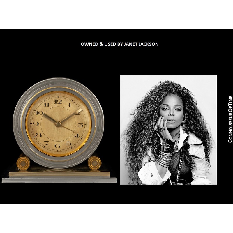 Today's offering showcases this very cool Art Deco desk clock with alarm owned and used by legendary performer Janet Jackson. It has a very lovely Art Deco design and fabulous chrome-plated case and integrated pedestal. Its dial has Breguet markers and ant