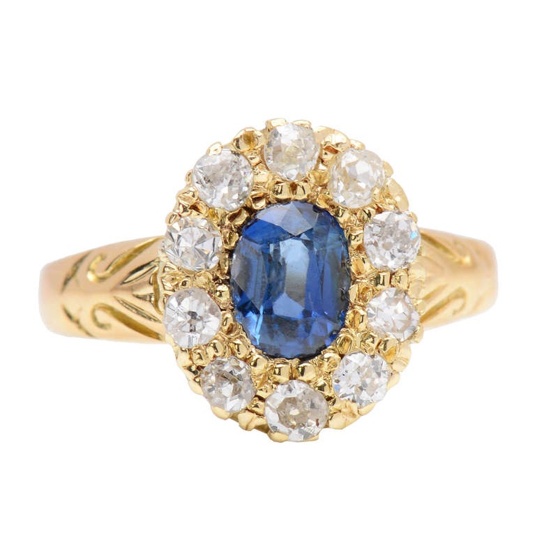 A flickering border of antique diamonds provides the light to set off the rich sapphire.