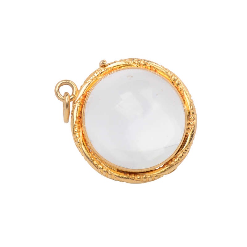 Everything that the cool crystal covers appears slightly magnified with an almost mystical quality. Two halves have been carved into the shape of an orb. Hinged at the bottom, a 14k solid gold patterned border surrounds each section.