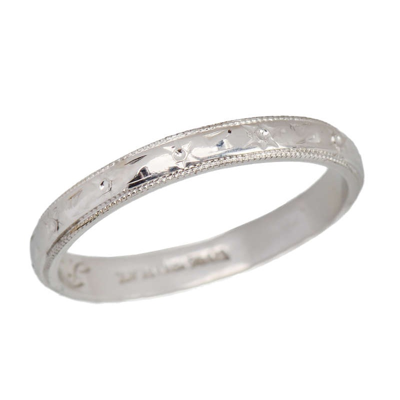 Made in America, this vintage platinum wedding band hails from the time when Harry S. Truman ruled our shores and Nat King Cole's tunes wafted over the radio waves.Patterned all around with a star (or flower) motif, the interior is hand-engraved with J.M.