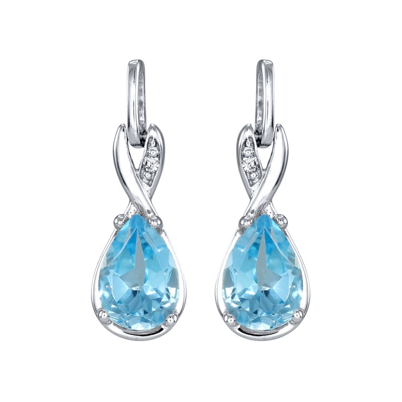 Charming and elegant. These lovely pear-shaped blue topaz drop earrings are made in 10K white gold and accented with two round diamonds. Designed in Canada.
