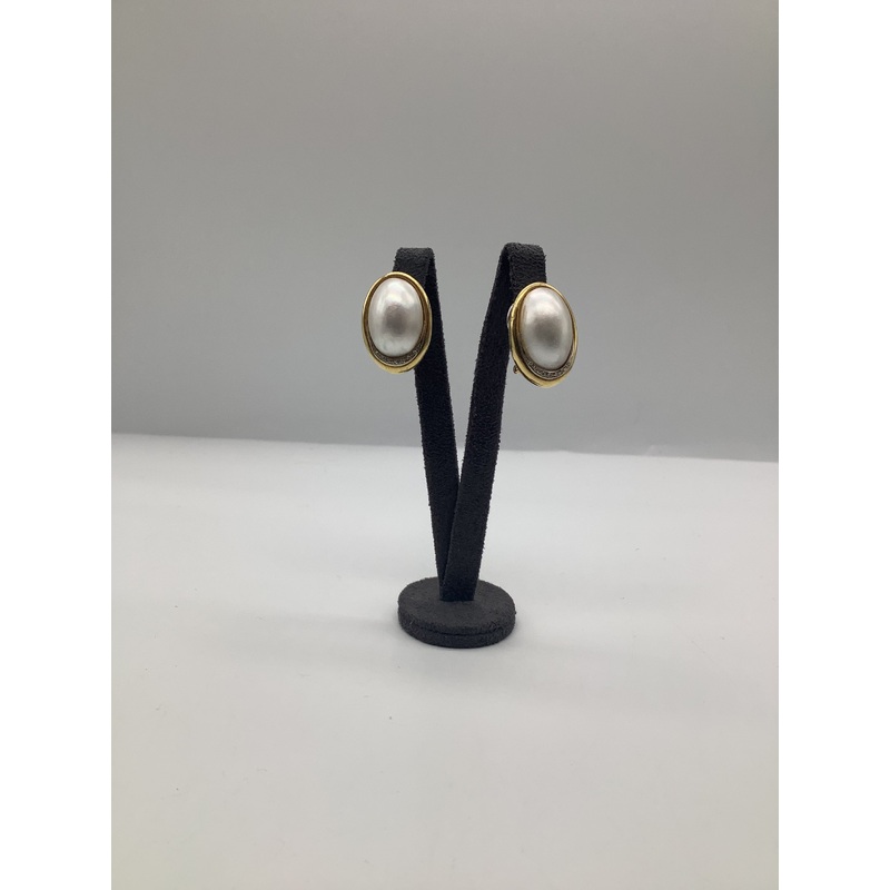Product Description:Exquisite Mabe Pearl and Diamond Earrings, meticulously crafted in 18ct yellow gold oversized studs. Each earring showcases a lustrous Mabe pearl, celebrated for its radiant nacre and substantial presence. Encircling the pearls are bril