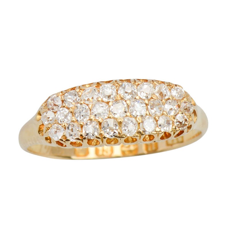 Twenty-five old cut diamonds rest arranged in three rows, with the middle row offset from the two outer ones. A glittering swathe of diamonds totals 3/4 of a carat (.75 carats). It is difficult to detect where one begins and another ends. A mix of antique