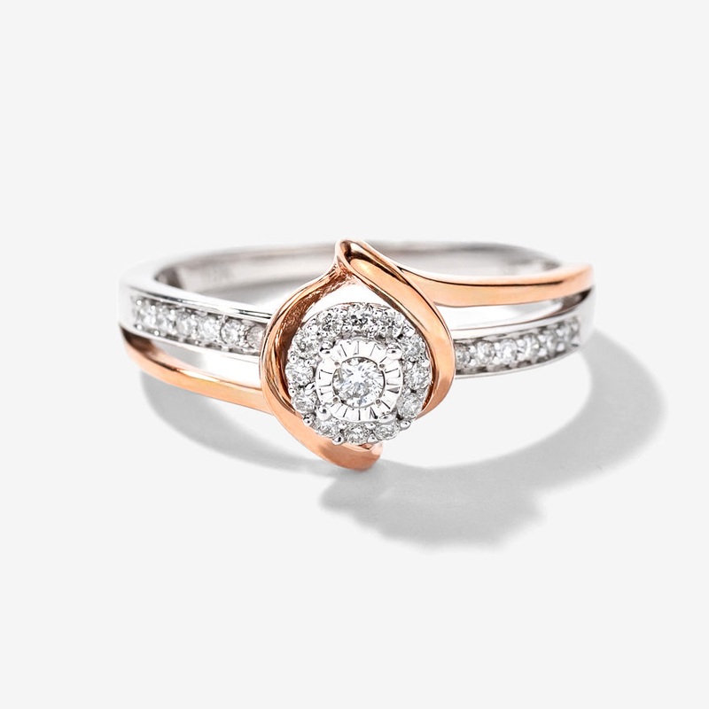 This beautiful 10K rose and white ring is perfect for an engagement, a promise, or just a night out! It features a brilliant cut centre diamond set in a diamond cut illusion setting for a bigger look, and is highlighted with sparkling diamonds and accents of rose gold.