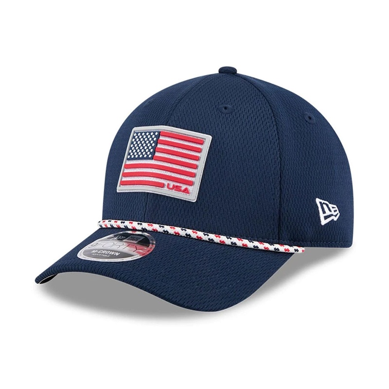 Saturday PGA Ryder Cup 2025 Dark Blue 9FORTY M-Crown CapUSA Flag patch with wordmark on frontStars embroidered on rightPGA Ryder Cup 2025 USA patch on rear archNew Era Flag embroidered on leftStructured modern crownSnapbackRope across visorCurved visorGrey