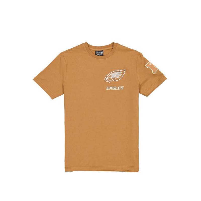 The Philadelphia Eagles Light Bronze Logo Select T-Shirt features a corduroy applique Eagles logo above an embroidered team wordmark at the left chest with a National Football Conference patch at the left sleeve.
