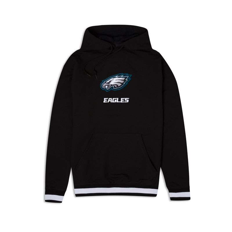 The Philadelphia Eagles Logo Select Black Hoodie features a chenille applique Eagles logo above an embroidered team wordmark at the chest.