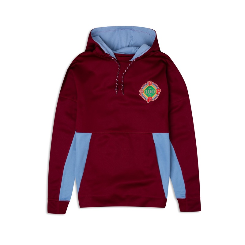 The Philadelphia Phillies Gold Leaf Hoodie features an embroidered 100 year patch at the left chest with a screen-printed Phillies wordmark above a team logo and gold foil leaf details at the rear.Fabric: 100% polyester