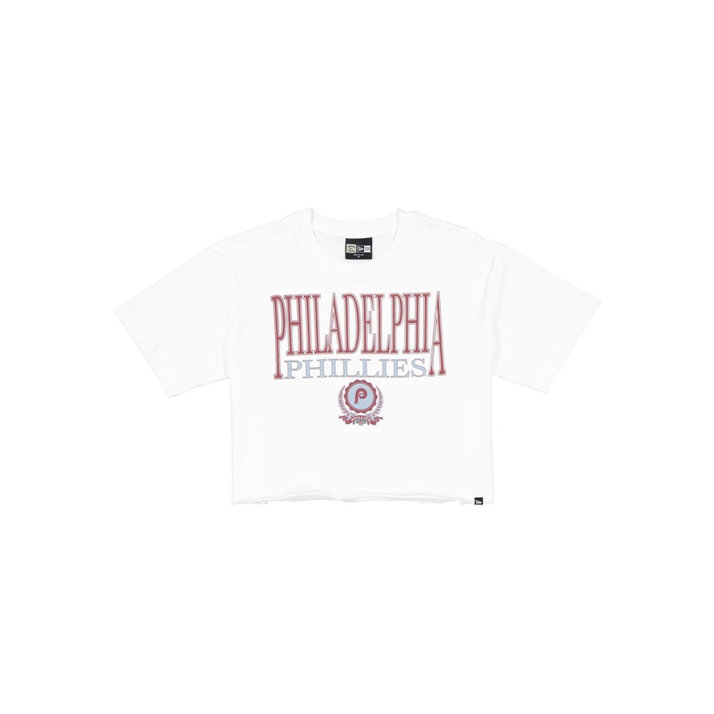 The Philadelphia Phillies Throwback Prep Women's Cropped T-Shirt features a screen-printed Phillies wordmark above a team emblem at the front.Fabric: 100% Cotton
