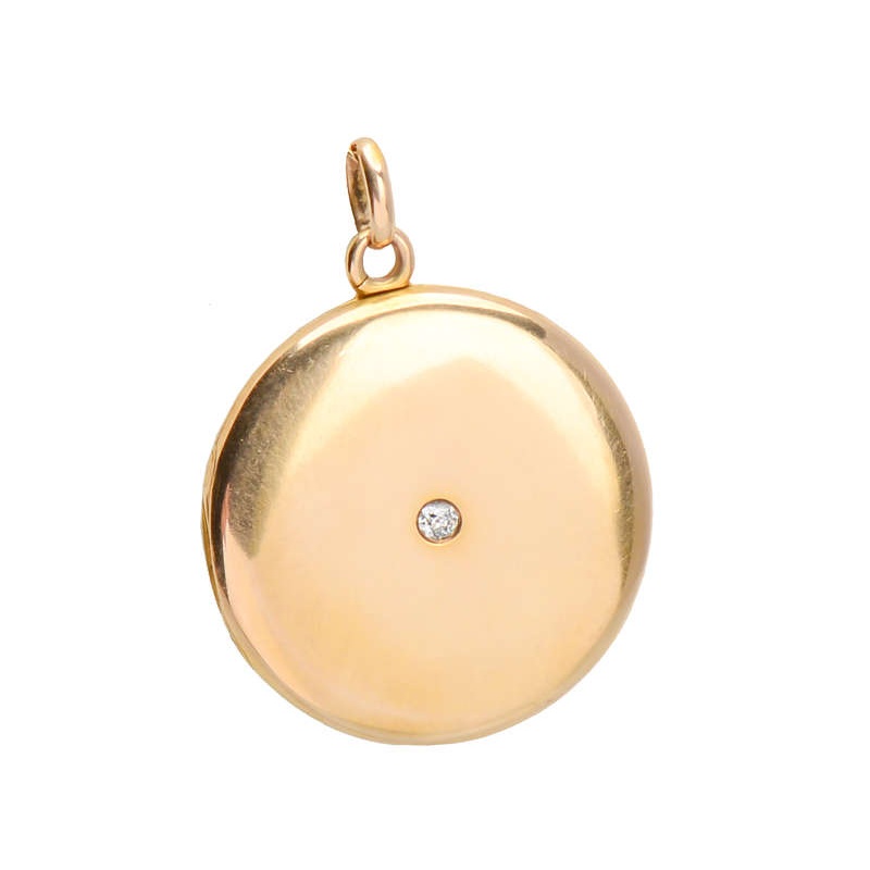 Round, smooth and silky in feel, this slim locket makes use of 14k yellow gold and an old European brilliant-cut diamond. Sleek and highly polished, it is an ideal medium size. Fine for everyday wear, yet large enough to show it off.