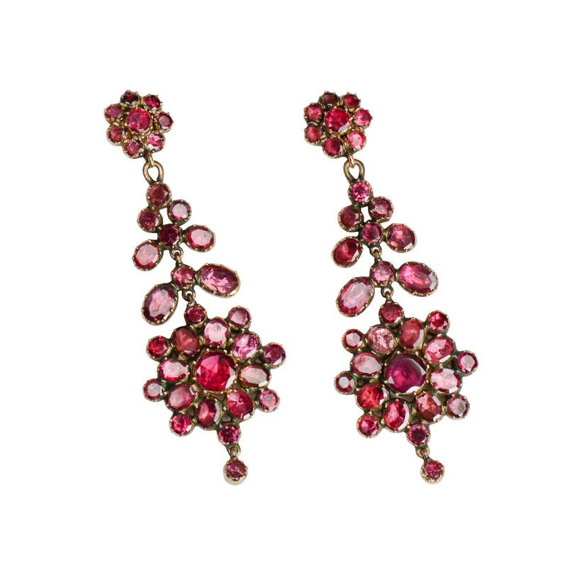 Superb overall, these earrings are set with flat-cut purple-hued garnets, ranging in shades from claret red, to light peony pink. Formerly day-night in configuration, that would have back-to-front ear wires, some time ago they were converted to a single earring with post fittings.