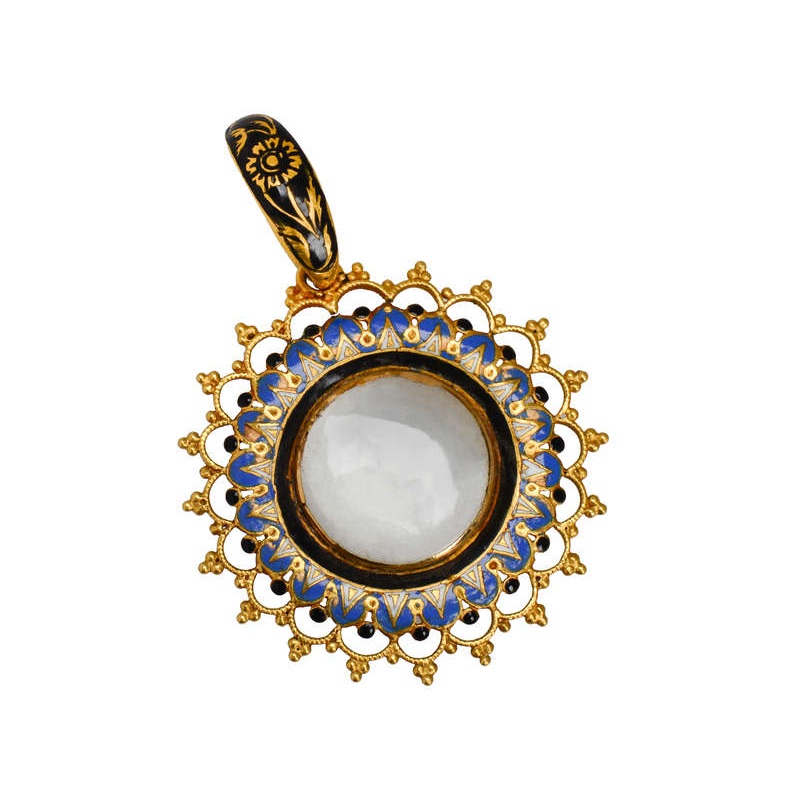 The circular locket, which opens from the back, is slightly convex. Surrounding it are rays of patterns, filled with opaque ivory, French blue, and black.