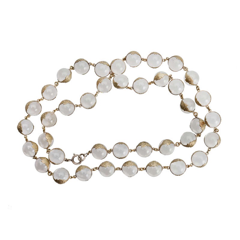 Necklaces of solid clear rock crystal quartz orbs are known as "pools of light"?. These polished spheres possess the optical quality of rotary polarization - when you look at an object through the crystal, the image will appear upside down or reversed. The