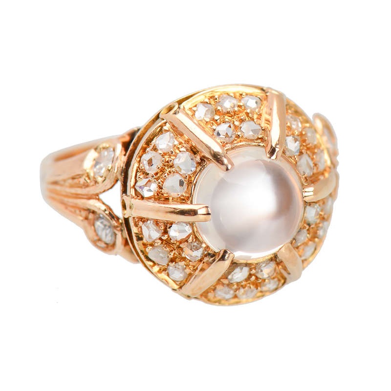 Replete with an air of sophistication, this glorious moonstone and rose cut diamond ring was created in Portugal in the 1940s.