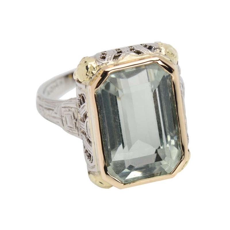 A setting of 14k gold white gold filigree sports four corners of yellow gold. Each of those takes on a flower and stem pattern. Around the gallery appear to be basket-like openwork designs.