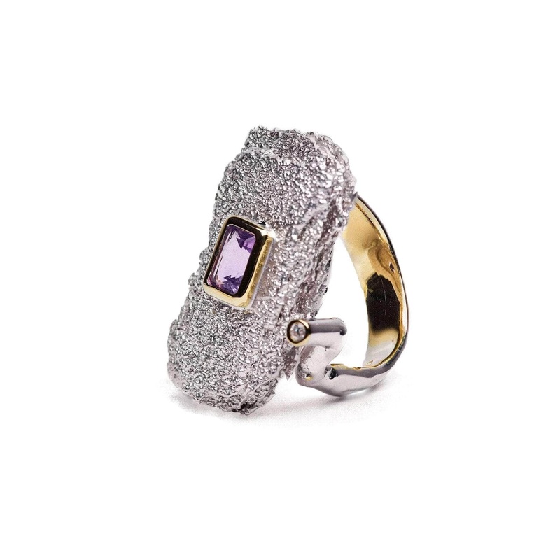 A striking purple amethyst is the central heartbeat of this stunning ring. It is made from a mixture of precious metals to combine together to create a conflicted harmony. Textured surfaces provide drama and impact. A delicate line of gold edges the precious central gemstone.
