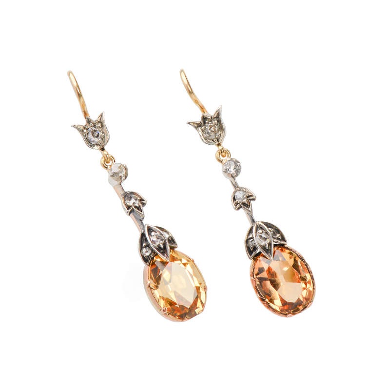 Precious topaz with its warm goldenrod glow imparts an impeccable foil to the silvery tones of the setting and diamonds.Each topaz is cut into a faceted oval shape and is then set into 10k yellow gold. Above is a line of silver topped gold dotted with six