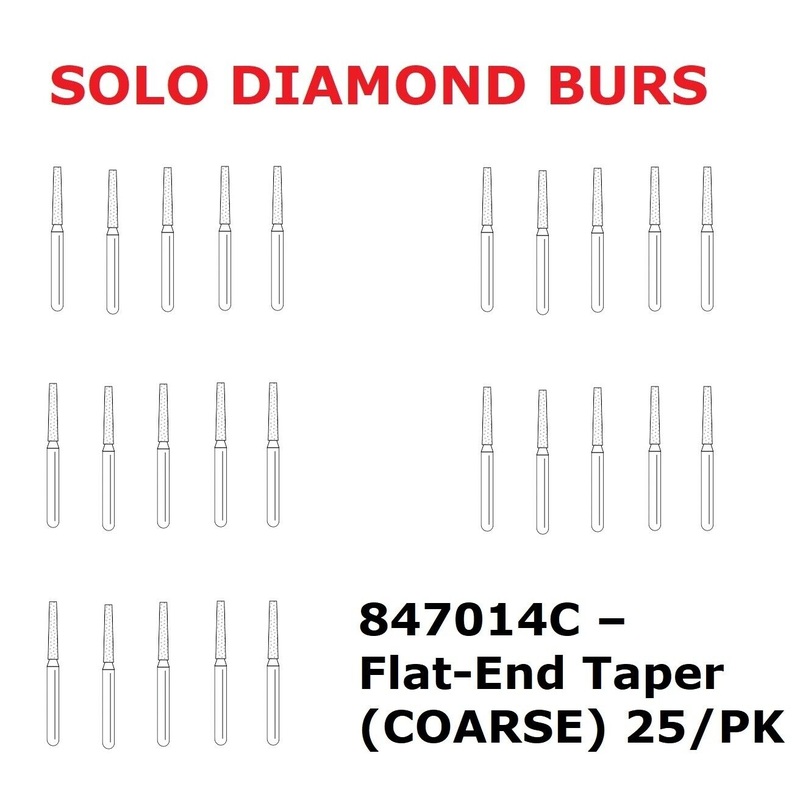 Premier Dental SOLO Premium Diamond Burs Flat-End Taper 25pcsNot all disposables are created equal!Solo Diamond Premium Diamond Burs are manufactured and sterilized in the U.S.A.Sterilization is guaranteed. Quarterly dose audits on file: validation summary