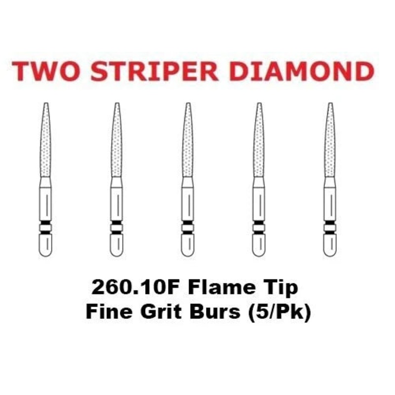 Premier Dental TWO STRIPER Diamond 260.10F Flame Tip Fine Grit Burs (5/Pk)Two Striper Diamonds Burs Chamfer Prep. Two Striper stays sharp longer and delivers faster, cooler cutting than electroplated brands. Which means fewer burs, less chair time and happ
