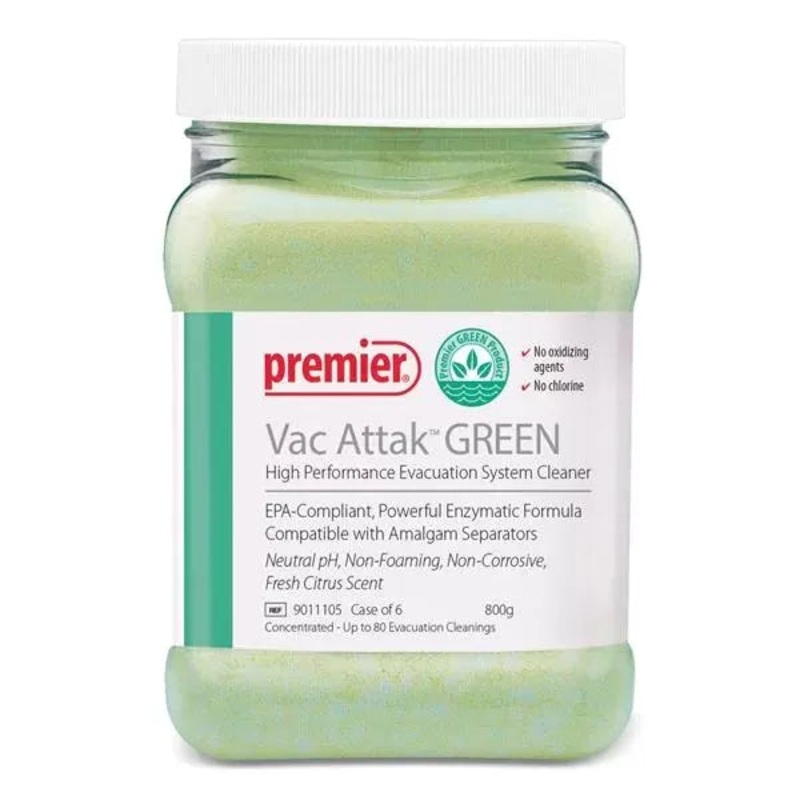 New Vac Attak GREEN is a high-performance evacuation system cleaner designed to comply with the EPAs Clean Water Act. Using a combination of powerful enzymes with powerful surfactant chemistry that gets the job done, Vac Attak GREENs environmentally-friendly formula meets the ADAs best management practices. With a neutral pH, its non-foaming and non-corrosive formula has no chlorine or oxidizing agents. Safe and gentle for every day use with all amalgam separators, this evacuation system cleaner is still Vac Attak-tough to clean your lines of bio-burden, prophy paste and fluoride gels.