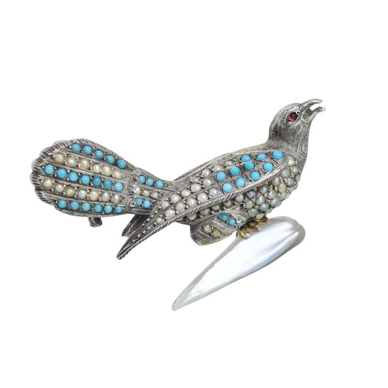 A garnet colored paste serves as its eye. Its wings, breast and tail are encrusted with turquoise cabochons and natural seed pearls. The body is silver and the reverse displays realistic textures all in this three dimensional bird pin. It still retains its original C clasp and tube hinge.