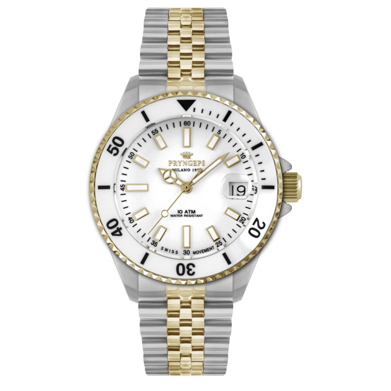 CASSAAcciaio bicolore diametro 38 mm, water resistant 10 ATM, corona serrata a vite personalizzata, crystal coated sapphire, fondello acciaio serrato a vite, Ghiera in ceramica lucida con indicatori luminescenti unidirezionale 120 scatti in acciaio, ghiera bianca o ghiera nera, spessore della cassa mm 12,16QUADRANTEBianco, indici, logo in rilievo, datario al 3BRACCIALEAcciaio bicolore, ansa 18 mm, chiusura deployante personalizzata con fermaglio di sicurezzaMOVIMENTOQuartz, Ronda 715, Swiss Moviment