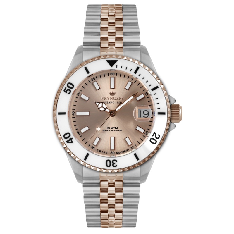 CASSAAcciaio bicolore rose gold diametro 38 mm, water resistant 10 ATM, corona serrata a vite personalizzata, crystal coated sapphire, fondello acciaio serrato a vite, lunetta in acciaio, Ghiera in ceramica lucida con indicatori luminescenti unidirezionale 120 scatti, spessore della cassa mm 12,16QUADRANTERose gold o nero ghiera bianca o ghiera nera, indici, indici applicati, logo in rilievo, datario al 3, solo tempoBRACCIALEAcciaio bicolore rose gold, ansa 18 mm, chiusura deployante personalizzata con fermaglio di sicurezzaMOVIMENTOQuartz, Ronda 715, Swiss Moviment