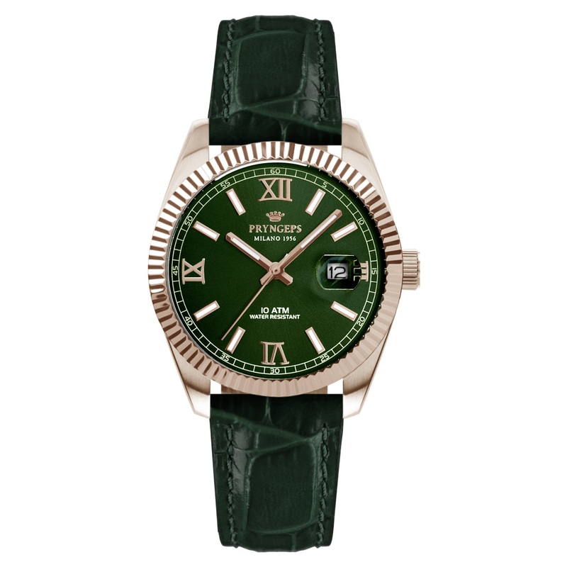 CASSAAcciaio bicolore rose gold diametro 32 mm, water resistant 10 ATM, corona serrata a vite personalizzata, crystal coated sapphire, fondello acciaio serrato a vite, Lunetta acciaio rose goldQUADRANTEVerde, cifre romane con indici in rilievo, logo in rilievo, datario al 3, solo tempoBRACCIALEPelle personalizzato, verde, ansa 16 mm, chiusura ad ardiglione personalizzataMOVIMENTOMiyota
