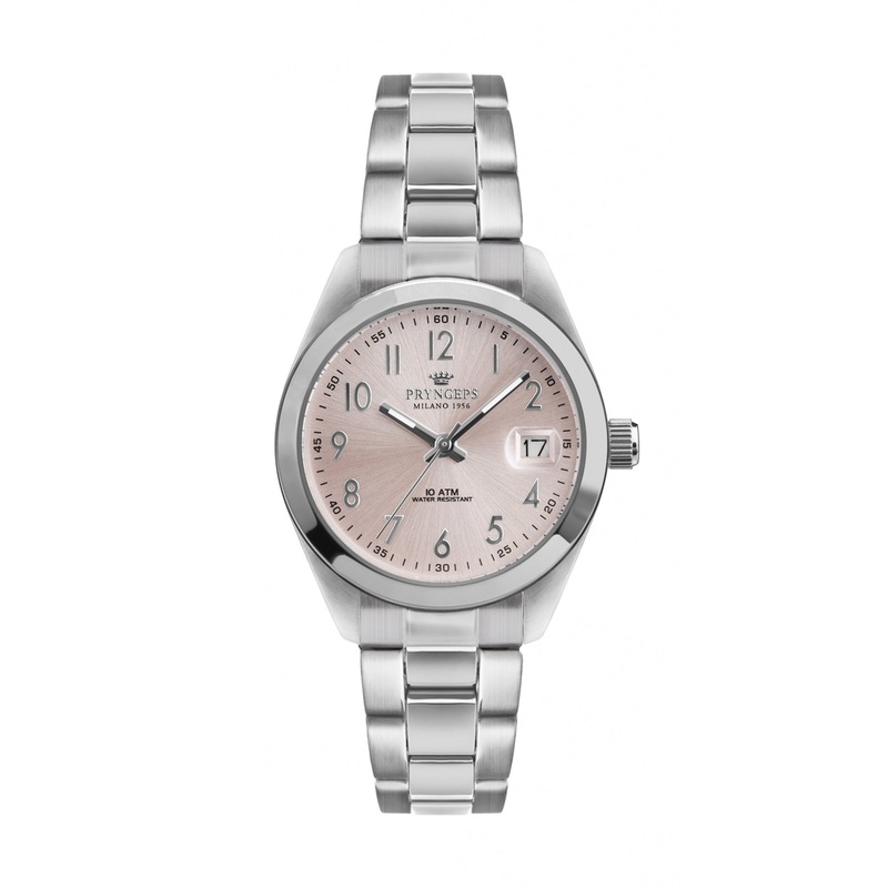 CASSAAcciaio diametro 33 mm, water resistant 10 ATM, corona serrata a vite personalizzata, crystal coated sapphire, fondello acciaio serrato a vite, lunetta in acciaio, Spessore della cassa mm 9,85QUADRANTERosa o bianco, cifre arabe in rilievo, logo in rilievo, datario al 3, solo tempoBRACCIALEAcciaio solido, ansa 16 mm, chiusura deployante personalizzata con fermaglio di sicurezzaMOVIMENTOQuartz, Miyota