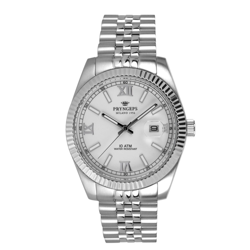 CASH DESKSteel diameter 40 mm, water resistant 100 ATM, screw-down crown, sapphire crystal, screw-down steel caseback, steel bezel, steelCLOCK FACEGun or white, Roman numerals with raised indexes, applied indexes, embossed logo, date window at 3 o'clockBRA