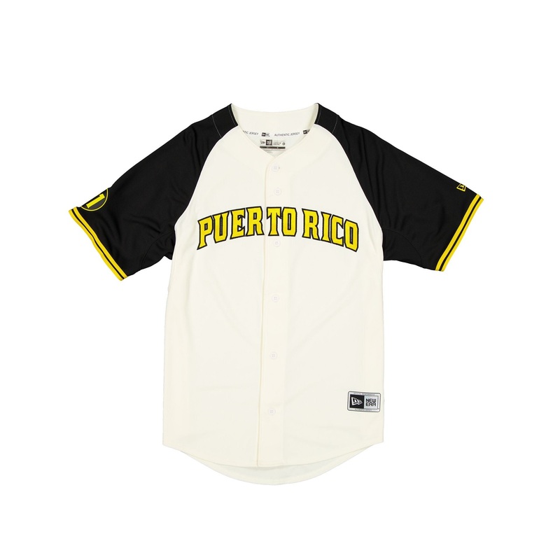 The Puerto Rico Alt 1 Jersey Puerto Rico wordmark applique at the chest with a New Era Official Merchandise patch at the front, a matching team logo at the right-wear sleeve, and a FBPR logo at the rear.
