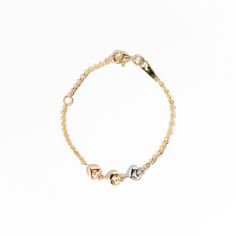 This enchanting Puff Heart Bracelet is a celebration of love and elegance, crafted in a stunning combination of 10K yellow, white, and rose gold. Each heart charm is delicately puffed, creating a soft, dimensional effect that catches the light beautifully.