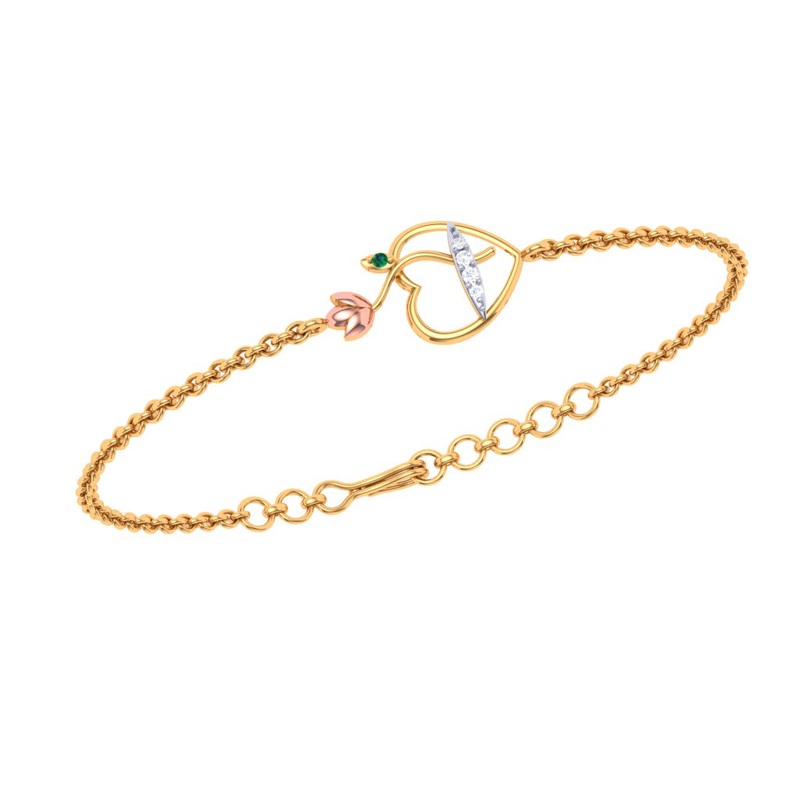 No nature lover should be without this heart gold & diamond bracelet. This bracelet is designed in the shape of a heart with a crimson rose and green crystal petals. The exterior of the heart is a beautiful design that is made out of gold, that is carefully embedded with Diamond in the center. this 18k bracelet design?s dimensions are 4.4 cm*5.5 cm*4.4 cm and weight is 2.2 grams. It comes with SGL/EGL/PCC certified.