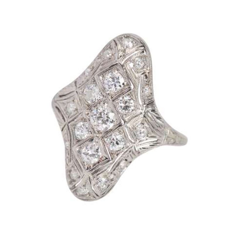 A north-south orientation to this Art Deco diamond ring elongates the finger and creates drama. A total of 1.15 carats leaves no room for doubt about its attributes.In filigree platinum with mille grain detailing (beaded edges), a geometry of nine diamonds