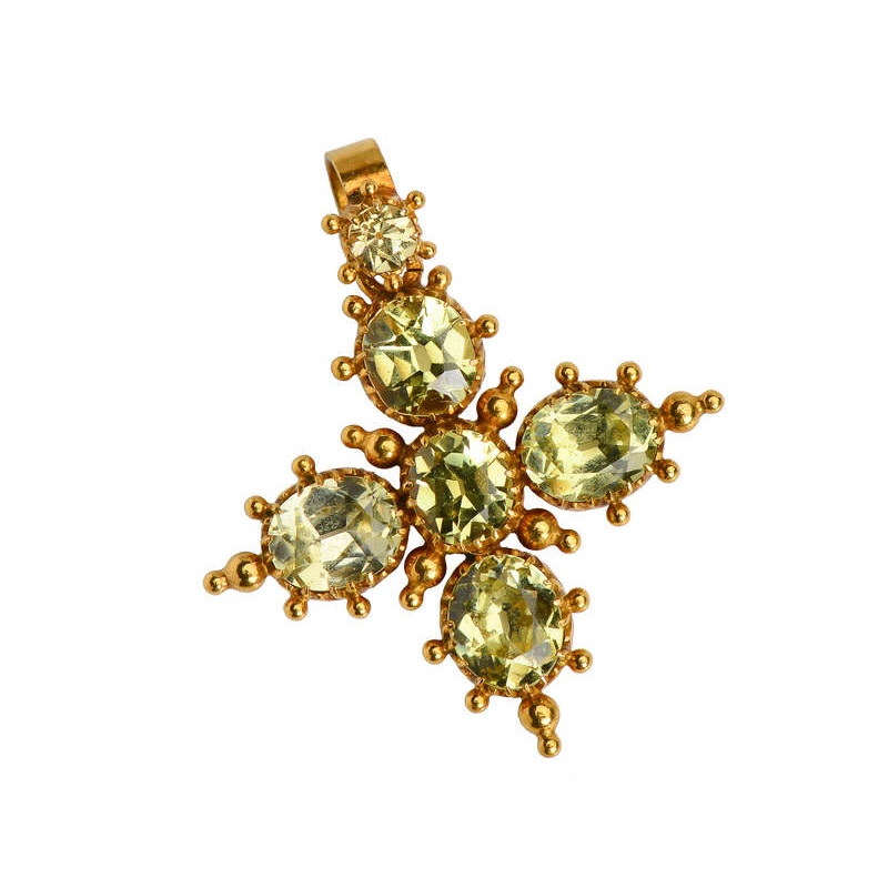 Spanish examples tend toward the grand. The English, however, placed a more understated spin on the large and opulent Spanish and Portuguese jewels. Here is a fine circa 1820s Georgian example; the gemstones resemble green “diamonds” for their sheer brilliance. The stones embellish a pendant set into 18k yellow gold.