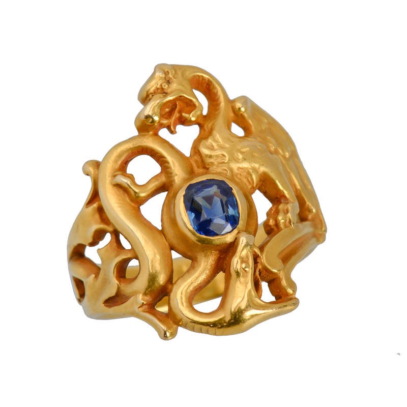 Kilgharrah the dragon befriended and protected Merlin according to Arthurian legend. You too can tame your own dragon in this noble Art Nouveau gold and sapphire ring.
