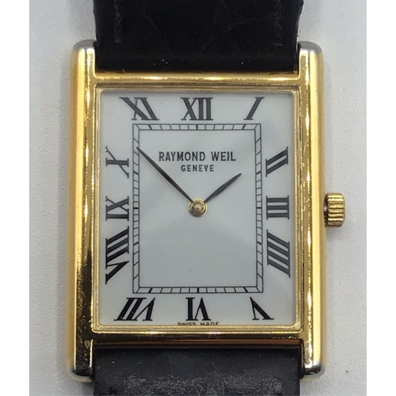 This tasteful men's Raymond Weil comes with it's original buckle and leather strap (worn).The watch case is rectangular, with a white background, hour and minute hands with Roman Numerals. The case is electroplated in Gold to 10 Microns. PAPERSNOBOXNOYEARU