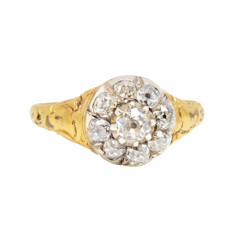 A jazzy melody for the eyes, behold this Victorian old mine cut diamond ring.Formed in a circular cluster, or in today's terms, a halo, it is a ring that keeps on giving. Wonderful, beefy, brilliant-cut old mine and cushion-cut diamonds give their all for