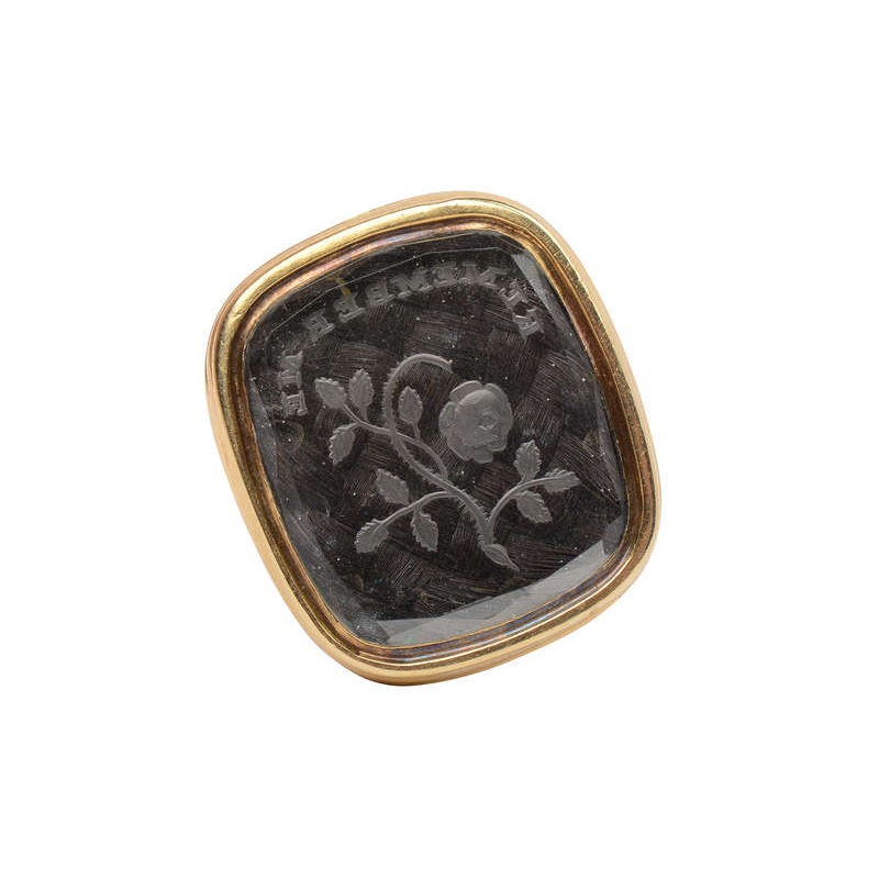 Beneath rests a plaited bed of auburn hair, completing the memorial fob or pendant.