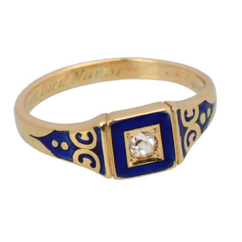 Cobalt blue enamel embellishes the top and shoulders of this distinctive ring.